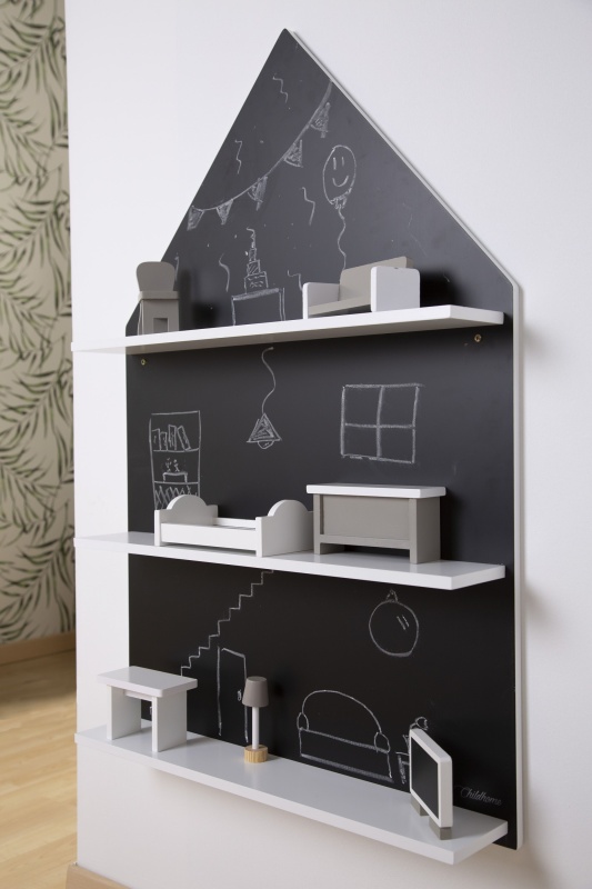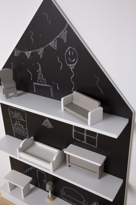 Polička na stenu v tvare domu so zadnou čiernou stenou ponúka využitie aj ako tabuľa na kreslenie či písanie kriedami. Materiál: MDF Rozmery: 60 x 90 x 11 cm