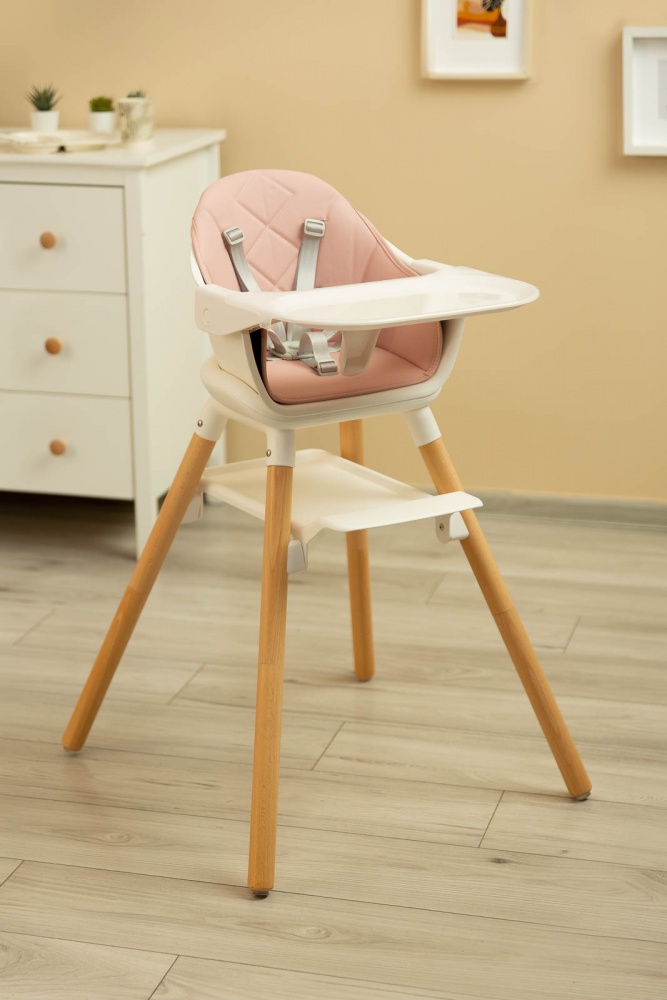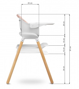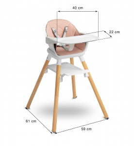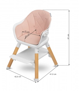 Hlavné črty: Viacúčelovosť - stoličku vysokú, ktorú možno ľahko premeniť na nízke kreslo alebo taburet Jedinečný dizajn a jemná farebnosť Mäkké, pohodlné sedadlo s päťbodovými bezpečnostnými pásikmi Solídne nohy z masívneho dreva Protipošmykové nožičky Snímateľné a ľahko čistiteľné čalúnenie z ekokože Odpínateľný pultík 2-úrovňové nastavenie opierky nožičiek Pre deti: od 6 mesiacov do 15 kg Podľa normy: 14988:2017+A1:2020