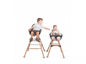 Moderná stolička 2v1 v kombinácii bukového dreva a bieleho plastu ponúka 2 výškové varainty použitia - k stolu štandardnej výšky 75 cm a k detskému stolíku výšky 50 cm. 5-bodový bezpečnostný pás, odnímateľné madlo a opierka nôh zaručujú pohodlné a bezpečné sedenie dieťaťa v stoličke.