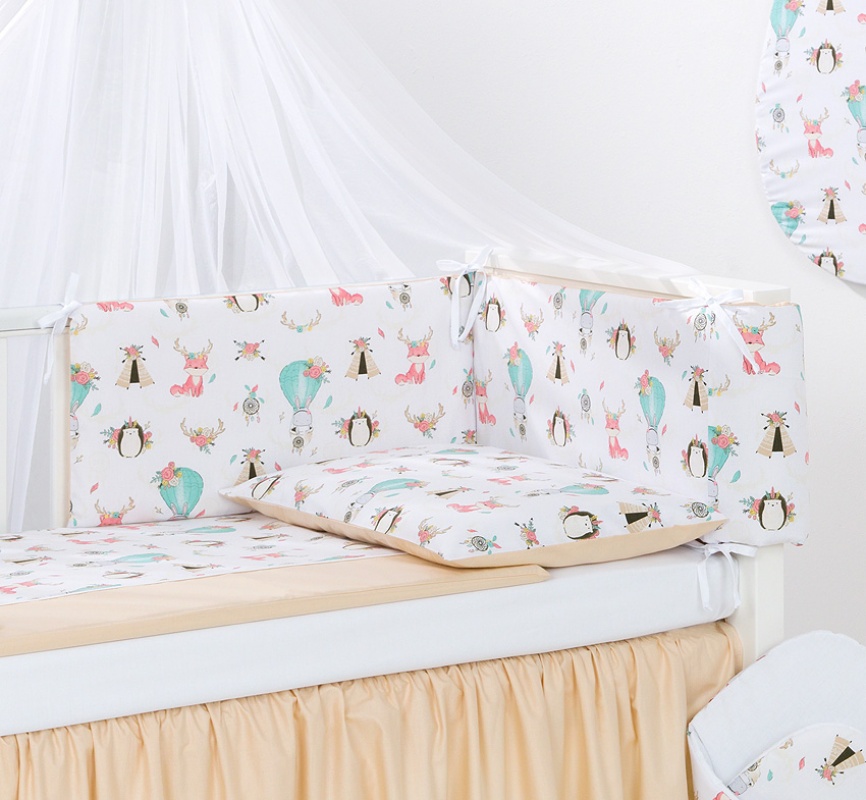 3. Chránič /hniezdo/ 30 x180 cm / výška v záhlaví 40 cm/ s rozoberateľnými časťami. Je možné používať obojstranne. Chránič má všitých 8 dlhých šnúrok, vďaka ktorým ho je možné ideálne pripevniť k postieľke.