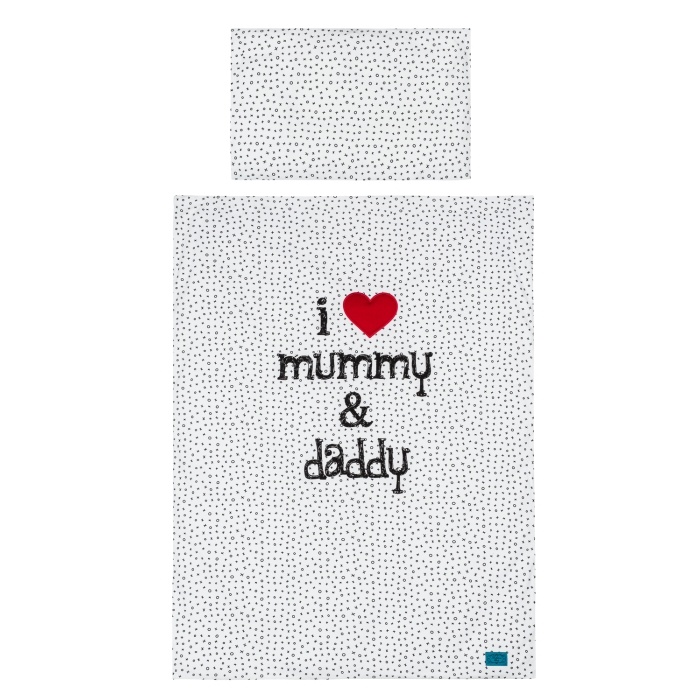 3 časťová balvnená sada s krásnym motívom a nápisom I love mummy and daddy. Sada obsahuje obliečku na paplónik, obliečku na vankúš, chránič.