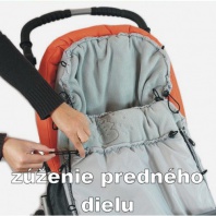 2. Pridaný diel v hornej zadnej časti fusaku sa stiahnutím šnúrkami zmení v kapsu, ktorá sa uchytením za opierku chrbta zamedzí zosúvaniu fusaku v kočíku.