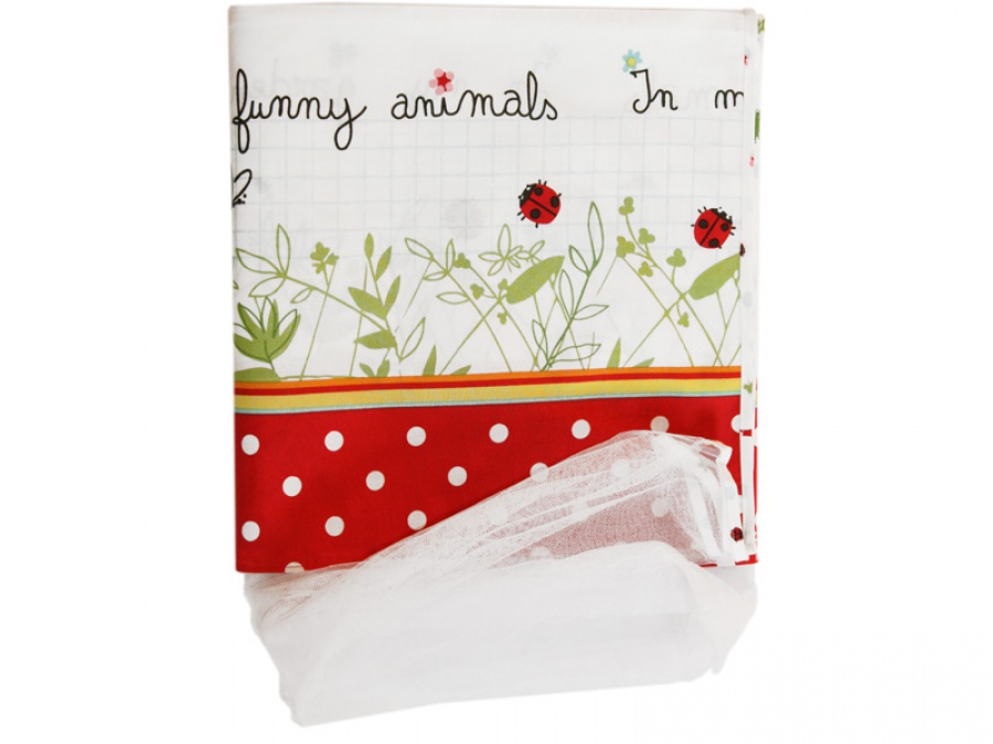 Baldachýn na detskú postieľku z červeno-bielej kolekcie Lúka s potlačou lúčnych kvetov a veselých zvieratiek. Svieža kombinácia červenej a bielej farby vženie do detskej izby čerstvý vzduch. Prírodný motív a biely šifón .