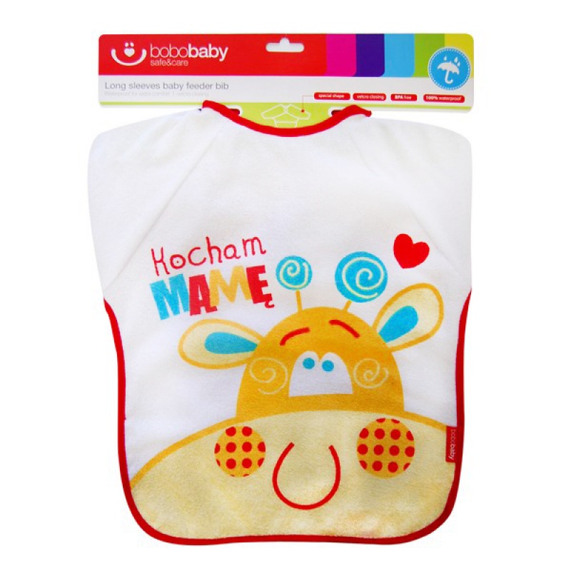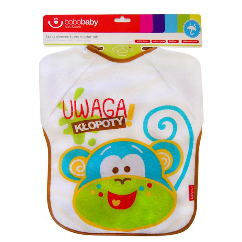 Podbradník s pútavým farebným motívom pre deti od 24m+. Materiál froté bavlna podšívaná voskovaným plátnom (PEVA) chráni dieťatko pred ušpinením a priesakom tekutín. Komfortný, jemný, poddajný, vhodný na doma, aj na cestovanie. Podbradník s rukávmi má na zadnom dieli suchý zips.