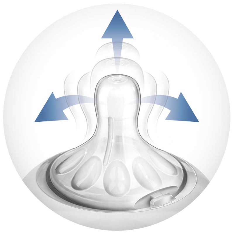 Silikónový cumlík AVENT má jedinečný patentovaný okraj, ktorý má inovovaný dvojitý ventil. Cumlík umožňuje prúdenie vzduchu do fľaštičky počas kŕmenia, čím zamedzuje vzniku vákua vo fľaštičke. Dieťa sa nemusí cumlíka pri kŕmení púšťať a môže piť súvisle ako pri dojčení bez prehĺtnutia vzduchu.