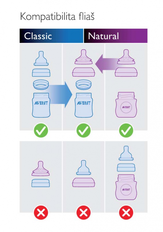 Na dojčenské fľaše AVENT Classic môžete použiť cumlík AVENT Natural, ktorý má na základni tesniacu manžetu, široký tvar podobný bradavke a jedinečný lupienkový dizajn jedine spolu so závitom z fľaše Natural.