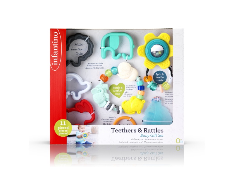 11-dielna sada hrkálok a hryzátiek obsahuje hrkálku v tvare kvetiny, korálkové hrkálka s mäkkými hryzátkami, 8 prepojiteľných krúžkov v tvare zvieratiek a hryzátko na šnúrke s krúžkom.