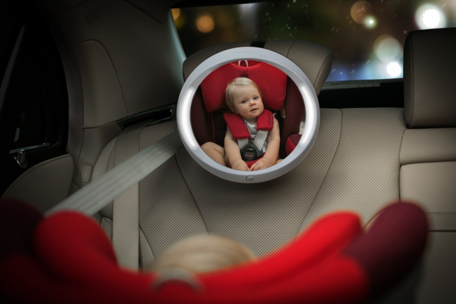 Veľké spätné zrkadlo s osvetlením ľahko pripevníte na opierku hlavy na zadnom sedadle. Diaľkový ovládač s klipom na slnečnú clonu vám umožní ovládať osvetlenie aj z pozície vodiča. Nastaviteľný uhol sklonu vám zaistí optimálny výhľad na dieťa. Môžete tak jednoducho a bezpečne aj počas jazdy kontrolovať dieťa sediace v autosedačke proti smeru jazdy.