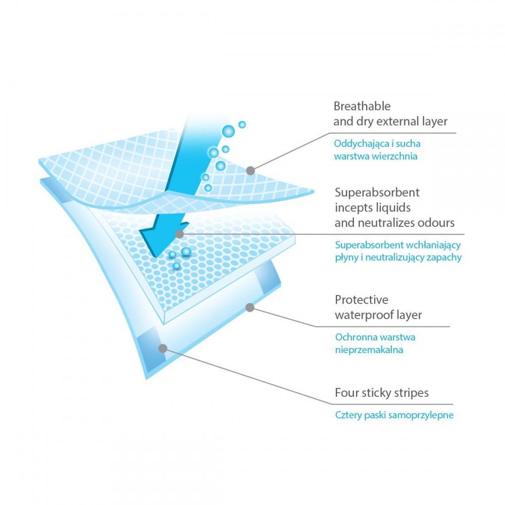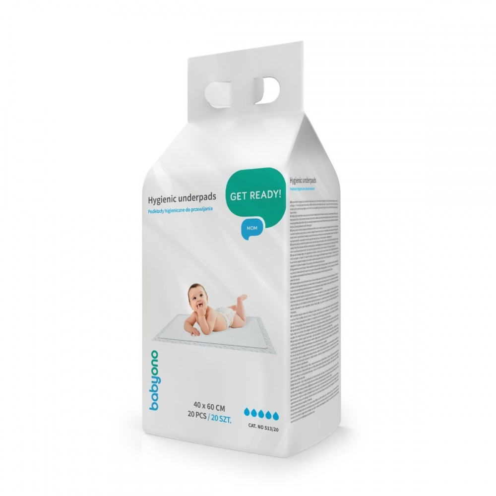 Hygienické vložky sú ideálne nielen na prebaľovanie dojčiat, ale aj pre ženy v pôrodných obdobiach. Veľmi absorpčné vložky poskytujú pocit hygieny a pohodlia. Vonkajší obal chráni pred nečistotami a samolepiace pásiky zabraňujú posúvaniu sa. Superabsorbent umiestnený vnútri vložky rýchlo absorbuje tekutiny a neutralizuje nepríjemné zápachy.
