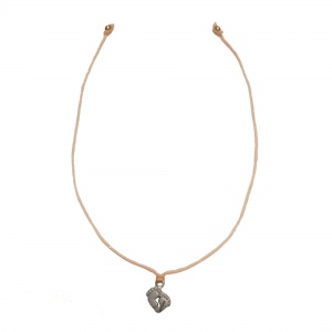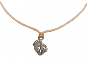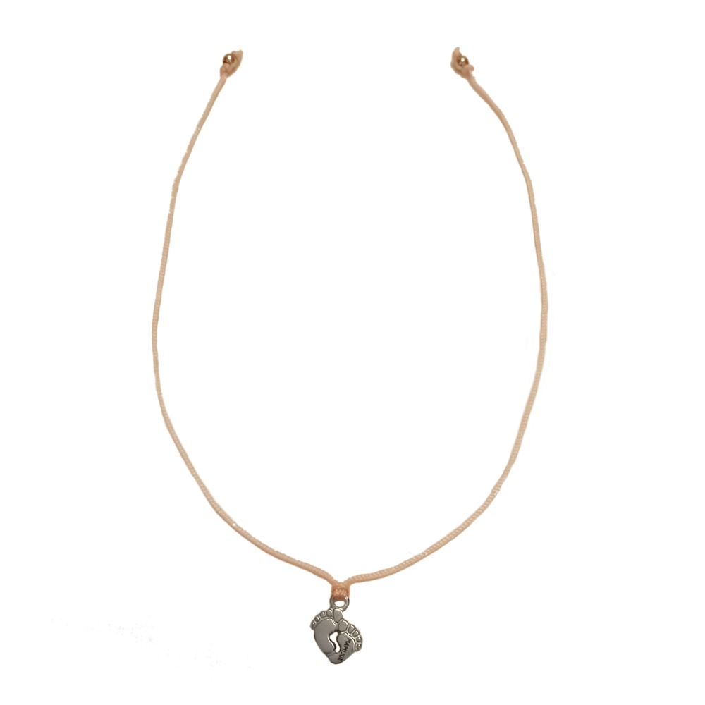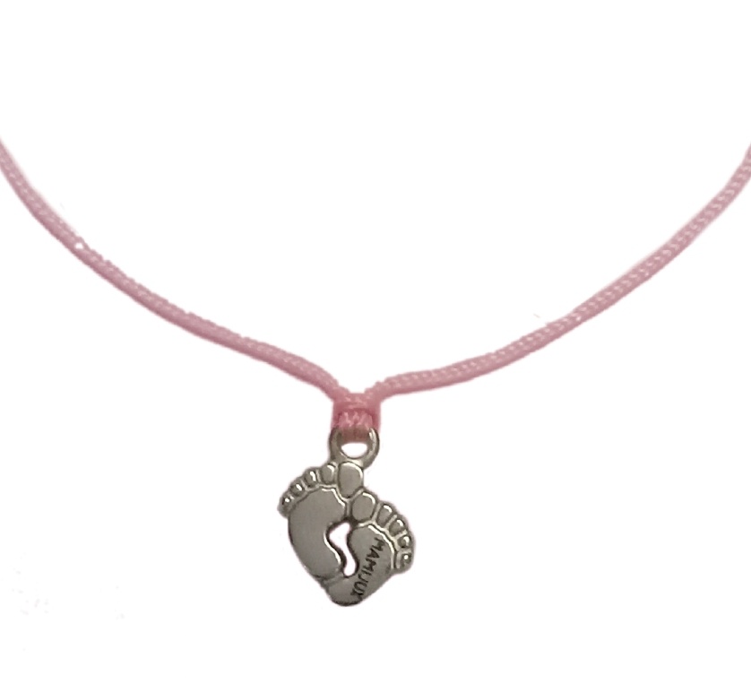 Tento šťastný náramok pozostáva z malého oceľového prívesku vo forme nožičiek s rozmermi 0,8 x 0,8 cm, ktorý je viazaný na ružový polyesterový šnúrke s dvoma malými oceľovými korálkami na koncoch.