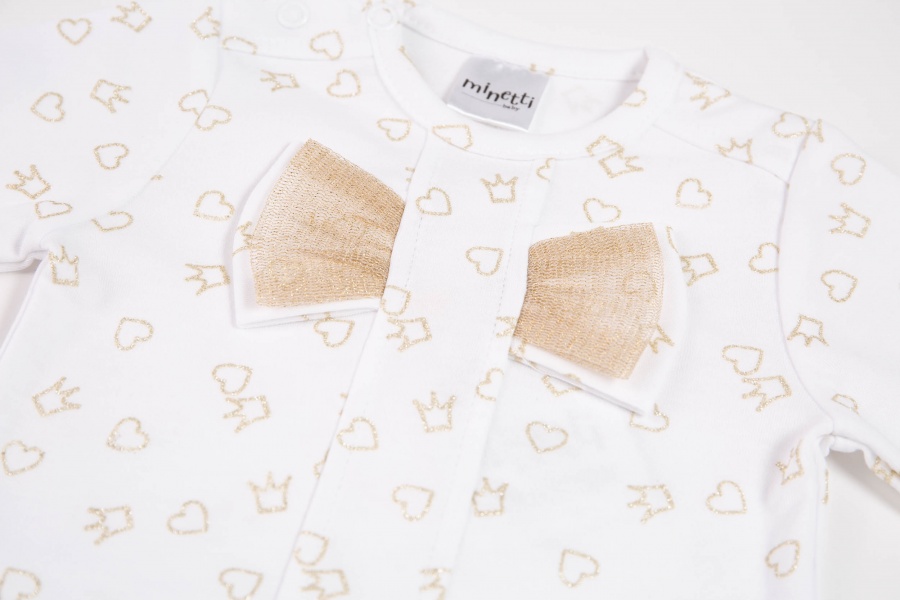 Bavlnené body pre dievčatko so zlatou potlačou a ozdobnou mašľou na prednej časti.