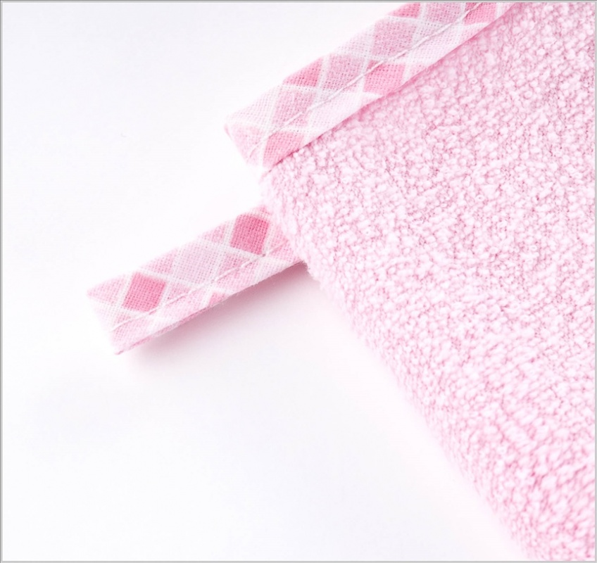 frotte rukavička na umývanie háčik na uchytenie/zavesenie obšitie farebnou bavlnenou látkou s výšivkou ovečky na prednom diely vnútorná strana -jemnučká fleece úprava